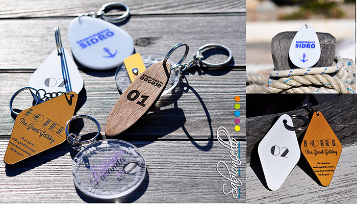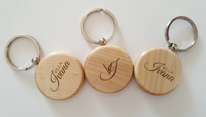 Različiti privjesci za ključeve izrađeni rezanjem i graviranjem na laseru