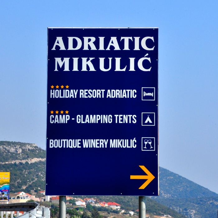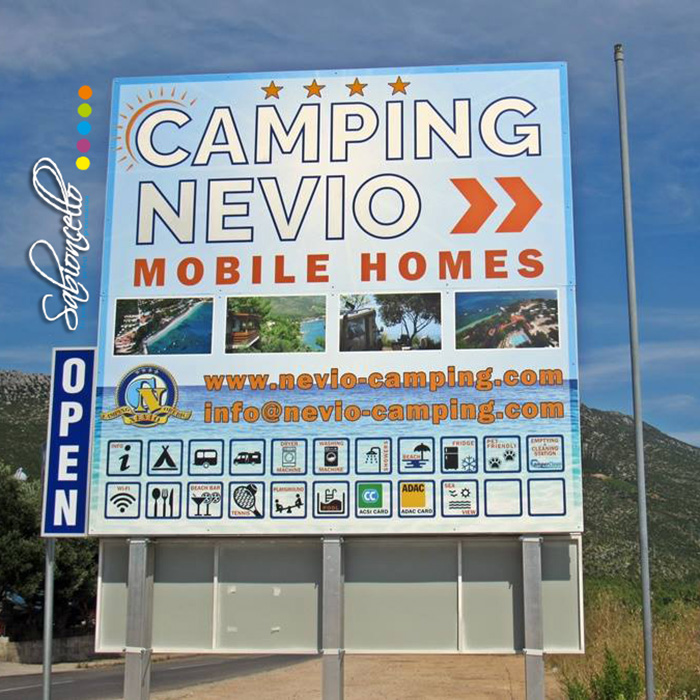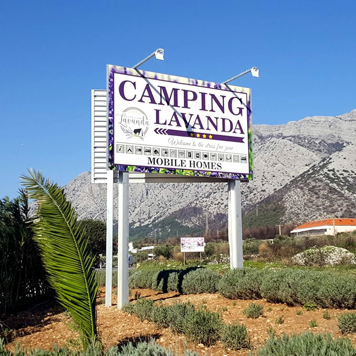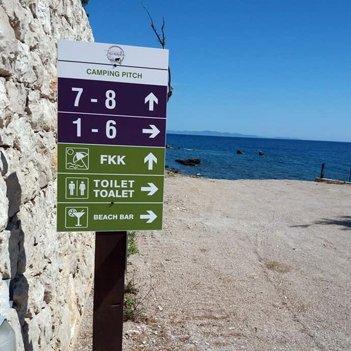 Putokazi za lakšu orijentaciju po kampu od drvenih greda i s licem od alubonda i folijom s UV zaštitom. Putokazi su montirani na kvadratne čelične profile te se jednostavno razmontiraju nakon sezone.