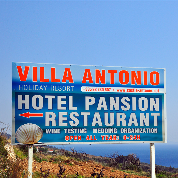 Putokazi za vinariju Korta Katarinu. Putokazi su napravljeni gravurom na zlatnoj dvoslojnoj plastici koja je ljepljena na prozirni pleksiglas 6mm debljine.