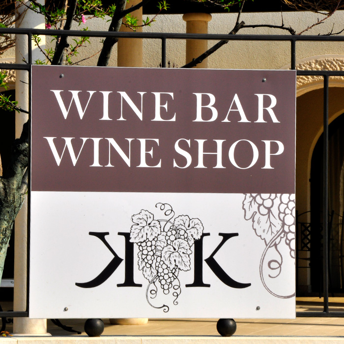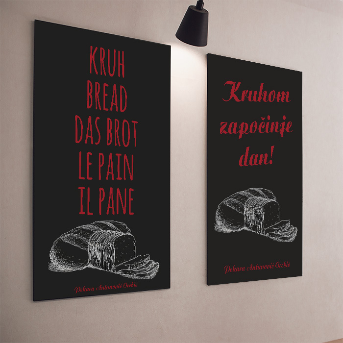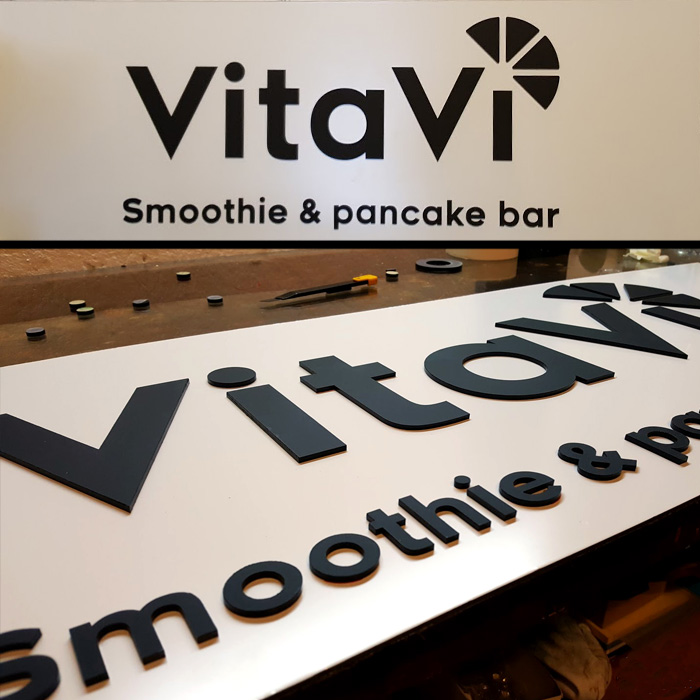 Natpisna tabla od 3D slova od crnog mat plexiglasa aplicirana na bijelu alu bond podlogu.